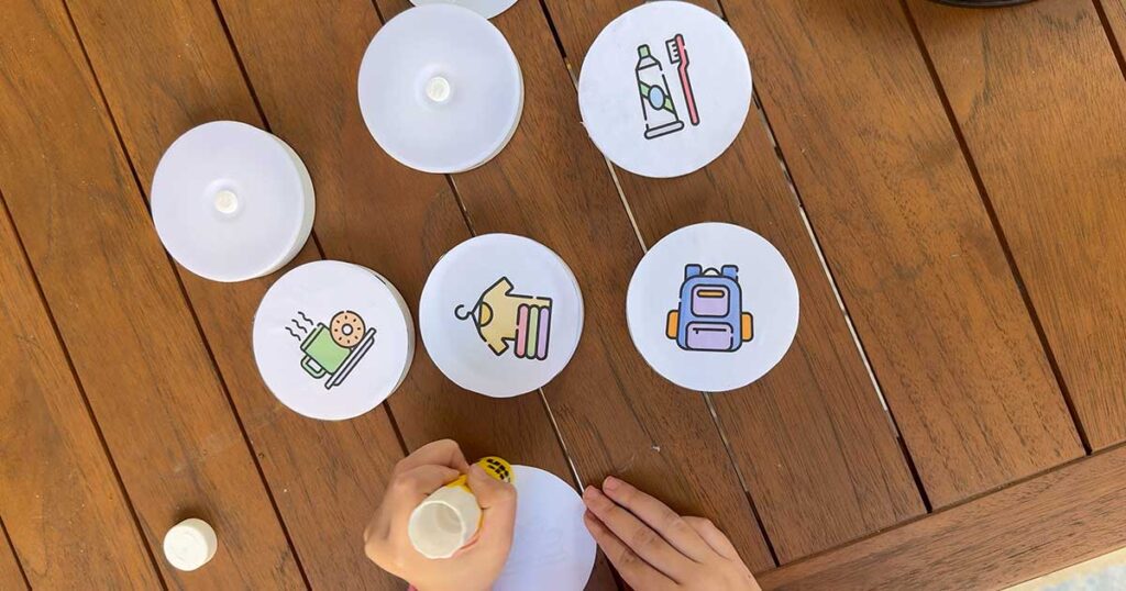 הרעיון פשוט להפוך כל שלב בבוקר למשימה ברורה שהילדים אחראים עליה. מדפיסים דף פעילות עם איורים של שלבי הבוקר, גוזרים לעיגולים וכל עיגול מייצג פעולה אחת. הילדים יודעים בדיוק מה מצופה מהם בלי ויכוחים ובלי עוד רגע.