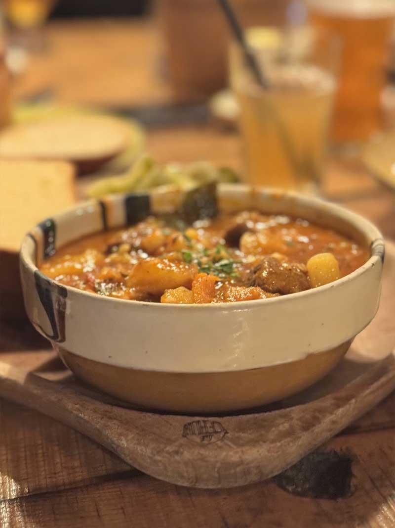 התפריט מבוסס על אוכל רומני מסורתי, עם מנות שמכינים לאט ובאהבה. אכלנו פולנטה עם גבינה מהתנור, תבשיל עוף עם רוטב שום, מרק שעועית שמוגש בתוך לחם ומנות כפריות נוספות שהיו פשוט טעימות ומנחמות. המנות נדיבות, המחירים הוגנים מאוד לאזור כזה מרכזי, ויש גם אופציות לצמחונים כך שקל להגיע בהרכב משפחתי או מגוון.